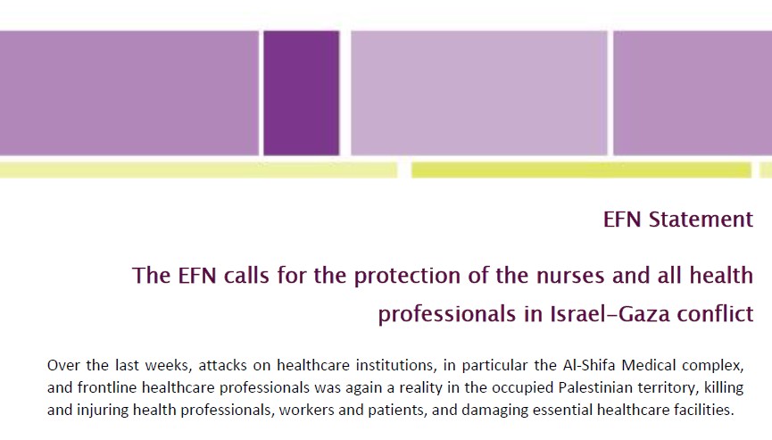 The EFN and its member National Nurses Associations from the EU and Europe are deeply concerned about this terrible situation. The EFN continues to condemn the conflict and these attacks on the healthcare facilities and is calling on all parties in this ongoing Israel and Gaza conflict for the protection and the respect of the work of nurses, and all health professionals, and to allow and ensure safe access of the population to healthcare. Healthcare facilities must not be military targets, and the healthcare professionals must not be prevented from performing their professional duties. The EFN calls for the neutrality of healthcare institutions and healthcare professionals, and that the principle of human rights is supported and protected. The EFN calls on the European Union to provide humanitarian and medical assistance, particularly for rehabilitation.