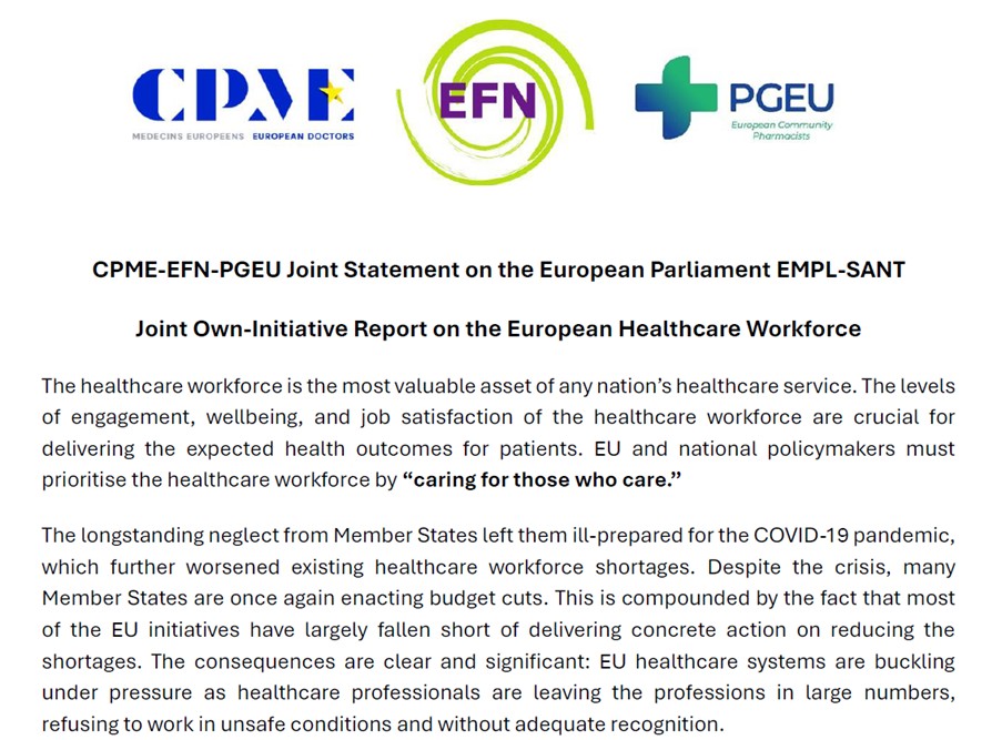 As the European Parliament EMPL and SANT Committees are starting to work on a Joint Own-Initiative (INI) Report ‘an EU health workforce crisis plan: sustainability of healthcare systems and employment and working conditions in the healthcare sector’, EFN, together with CPME and PGEU, is officially launching a joint statement, which clearly outlines the shared priorities and expectations of 5 million European Doctors, Nurses, and Community Pharmacists.