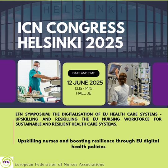 The symposium that the EFN organised in Helsinki (Finland), in the context of ICN Congress 2025, showed how frontline nurses are helping to design digital tools and AI that meet their frontline needs in daily clinical practice, and explored how EU legislation (Directive 2013/55/EU & Annexe V; Pact for Skills; European Semester and the Recovery and Resilience Facility; European Pillar of Social Rights; EHDS; EU AI Act; NIS2 Directive; European action plan on the cybersecurity of hospitals and healthcare providers) supports the frontline deployment of safe and fit-for-purpose digital tools, as well as the upskilling and reskilling of the nursing workforce, to meet the demands of a rapidly evolving digital landscape, helping nurses to stay at the centre of the digital transition.